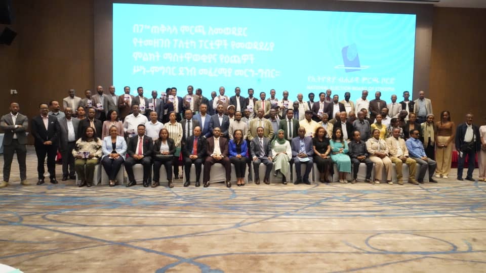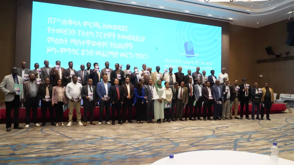 The National Election Board of Ethiopia (NEBE) organized an event at the end of the past week where political parties participating in the 7th General Election signed the Election Code of Conduct. Melatwork Hailu, Chairperson of NEBE, delivered the opening remarks in the presence of political parties, civil society organizations, and media, during which 48 contesting parties’ election symbols were launched.